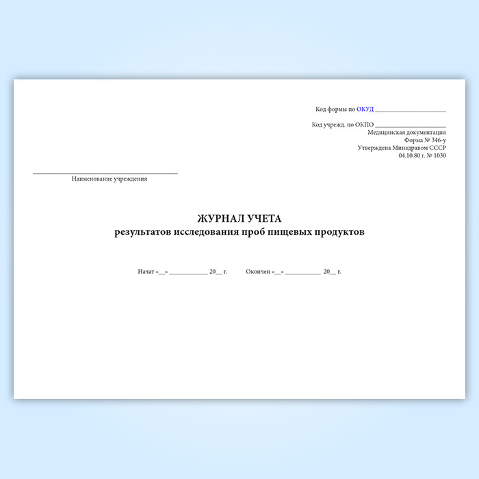 Форма журнала учета результатов исследования проб пищевых продуктов (Форма 346/у) утверждена Приказом Минздрава СССР № 1030 «Об утверждении форм первичной медицинской документации учреждений здравоохранения» от 04 октября 1980 года (с изменениями на 31 декабря 2002 года).