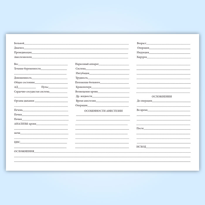 В журнале учета наркозов фиксируют не только течение анестезии и операции, но и отмечают краткую историю болезни пациента, возникновение осложнений.