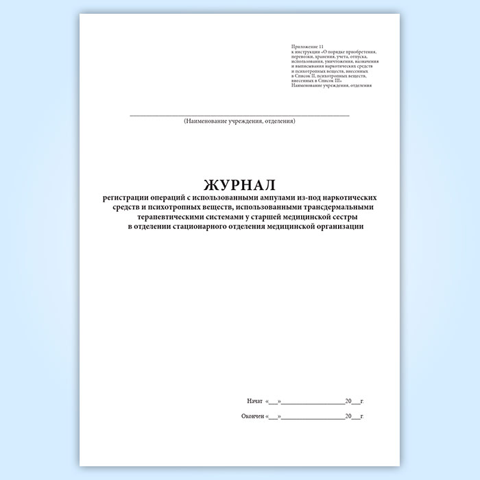 Форма Журнала регистрации операций с использованными ампулами из-под наркотических средств и психотропных веществ, использованными трансдермальными терапевтическими системами у старшей медицинской сестры в отделении стационарного отделения медицинской организации соответствует Приложению 11 к инструкции "О порядке приобретения, перевозки, хранения, учета, отпуска, использования, уничтожения, назначения и выписывания наркотических средств и психотропных веществ, внесенных в Список II, психотропных веществ, внесенных в Список III".
