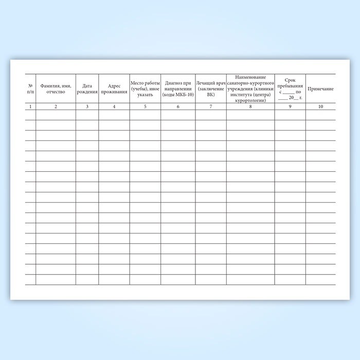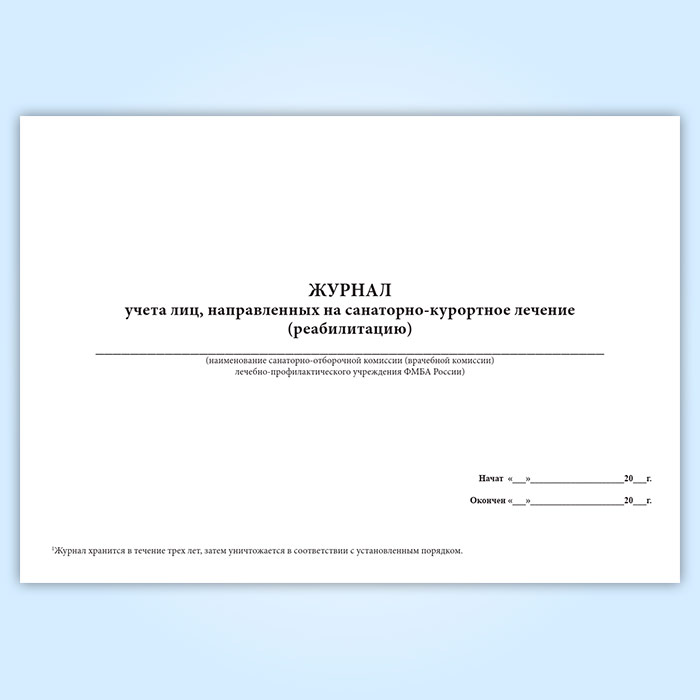 Форма Журнала учета лиц, направленных на санаторно-курортное лечение (реабилитацию) соответствует Приложению 1 к Приказу Федерального медико-биологического агентства от 5 мая 2012 г. № 111 “Об утверждении форм документов учета, применяемых при организации санаторно-курортного лечения и реабилитации в учреждениях, подведомственных Федеральному медико-биологическому агентству" .