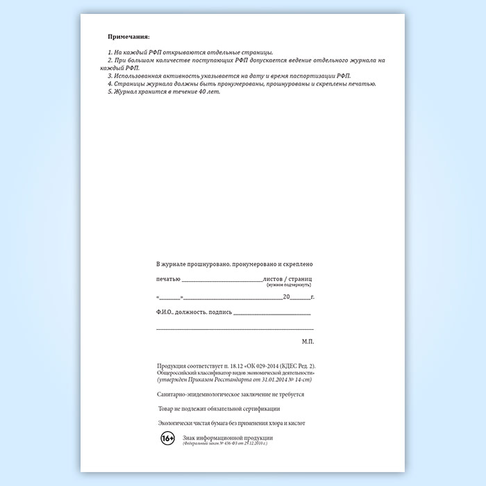Информация о получении РФП и последующем его использовании заносится в журнал.