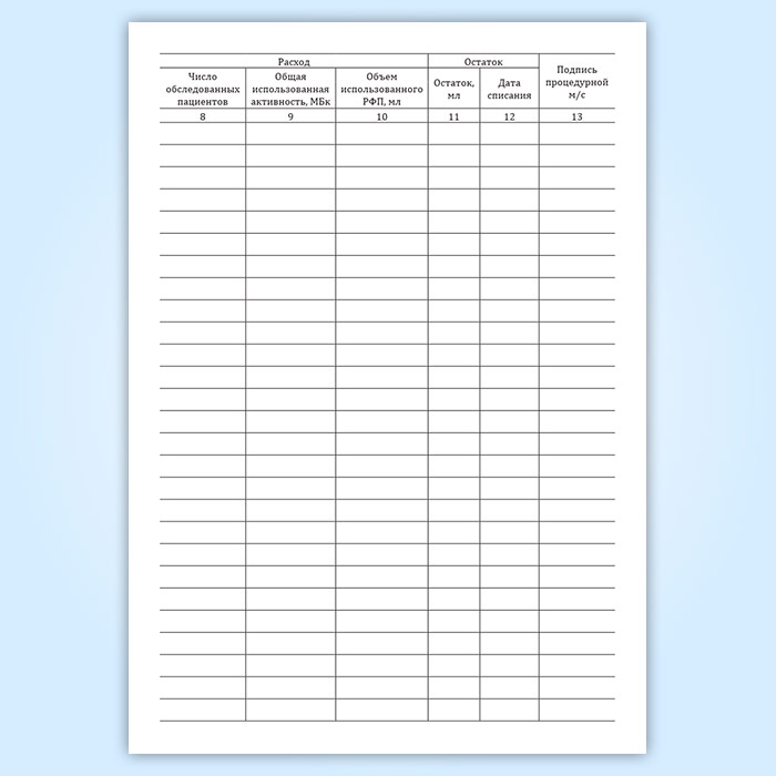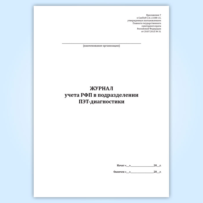 Форма журнала учета РФП в подразделении ПЭТ-диагностики соответствует Приложению 7 к СанПиН 2.6.1.3288-15. Гигиенические требования по обеспечению радиационной безопасности при подготовке и проведении позитронной эмиссионной томографии.