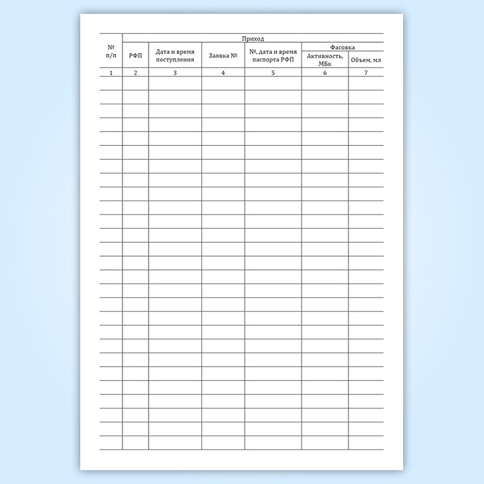 Графы журнала учета РФП в подразделении ПЭТ-диагностики: