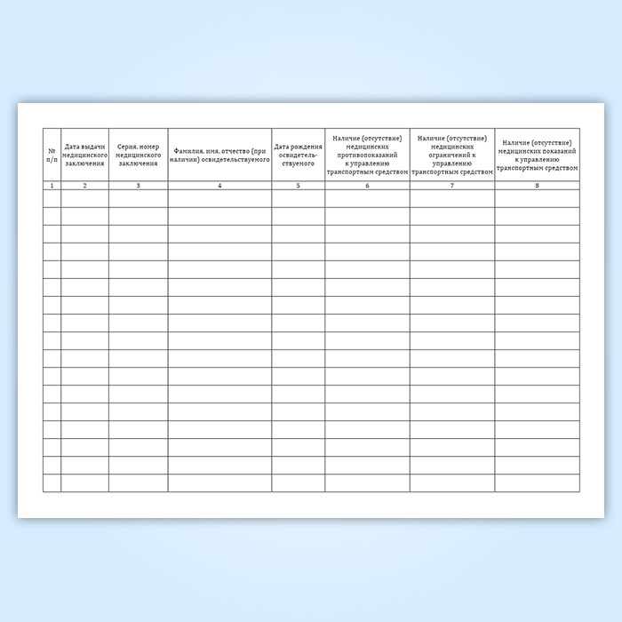 Журнал регистрации выданных медицинских заключений о наличии (об отсутствии) у водителей транспортных средств (кандидатов в водители транспортных средств) медицинских противопоказаний, медицинских показаний или медицинских ограничений к управлению транспортными средствами имеет графы: