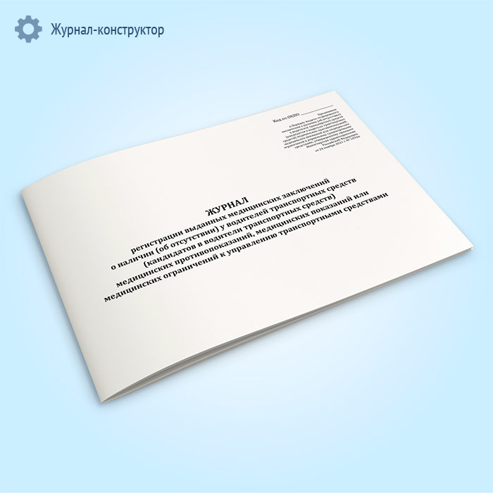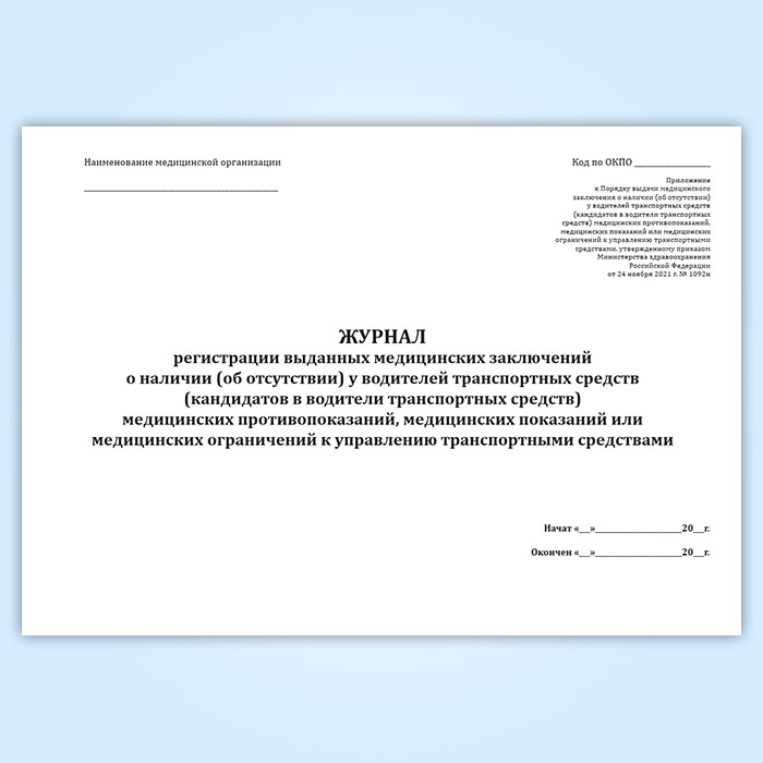 Форма журнала регистрации выданных медицинских заключений о наличии (об отсутствии) у водителей транспортных средств (кандидатов в водители транспортных средств) медицинских противопоказаний, медицинских показаний или медицинских ограничений к управлению транспортными средствами соответствует Приложению к Приказу Минздрава России от 24.11.2021 N 1092н " Об утверждении порядка проведения обязательного медицинского освидетельствования водителей транспортных средств (кандидатов в водители транспортных средств), порядка выдачи и формы медицинского заключения о наличии (об отсутствии) у водителей транспортных средств (кандидатов в водители транспортных средств) медицинских противопоказаний, медицинских показаний или медицинских ограничений к управлению транспортными средствами, а также о признании утратившими силу отдельных приказов Министерства здравоохранения Российской Федерации"