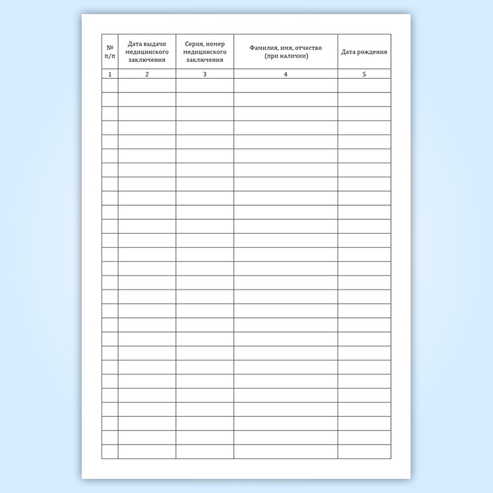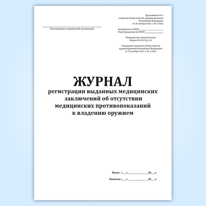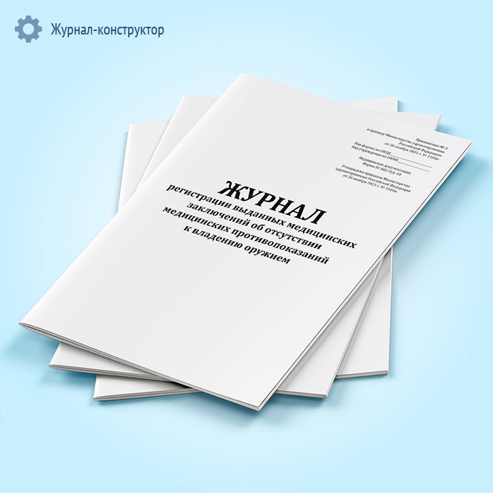 Согласно Приказа Минздрава России от 26.11.2021 N 1104н "Об утверждении порядка проведения медицинского освидетельствования на наличие медицинских противопоказаний к владению оружием, в том числе внеочередного, и порядка оформления медицинских заключений по его результатам, форм медицинского заключения об отсутствии медицинских противопоказаний к владению оружием и медицинского заключения об отсутствии в организме наркотических средств, психотропных веществ и их метаболитов" выданные медицинские заключения об отсутствии медицинских противопоказаний к владению оружием подлежат обязательной регистрации в журнале регистрации выданных медицинских заключений об отсутствии медицинских противопоказаний к владению оружием, форма которого предусмотрена приложением № 3 к настоящему приказу.
