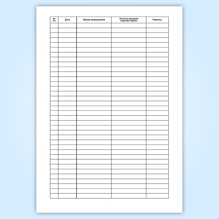 Чаще в медицинских организациях используется журнал регистрации и контроля бактерицидной установки, который имеет несколько иные графы.