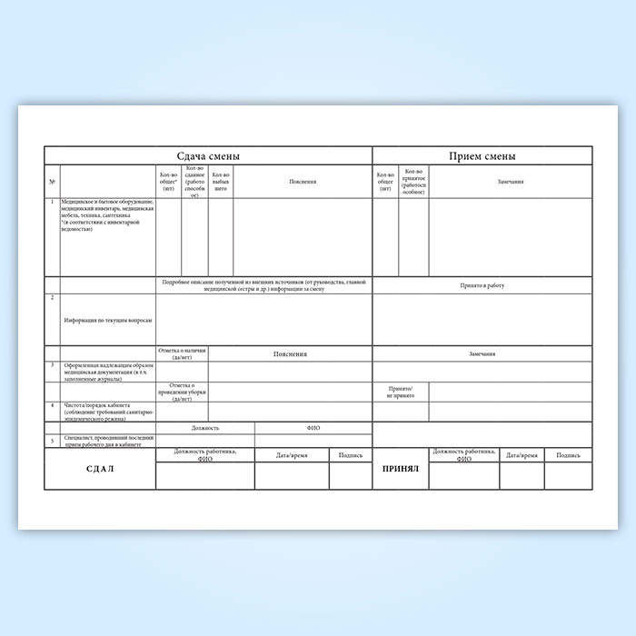 В журнале приема-передачи смен фиксируют основные рабочие вопросы, состояние оборудования и кабинета, наличие медицинской документации, а также ФИО специалистов, проводивших прием в кабинете.