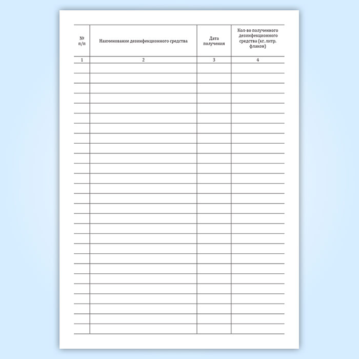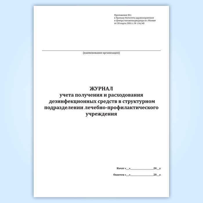 Форма журнала соответствует Приложению 1 к Приказу Комитета здравоохранения г. Москвы и ЦГСЭН в г. Москве от 28.03.2001 N 136/48 "Об учете получения, расходования дезинфекционных средств и проведения дезинфекционных мероприятий в лечебно-профилактических учреждениях"