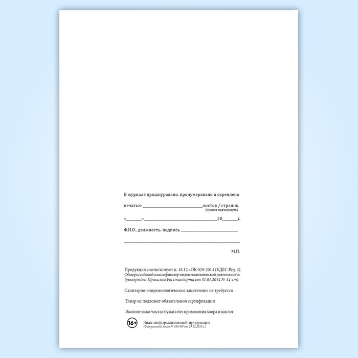Вы получаете печатную продукцию прошнурованной и c местом для вашей печати в соответствии с действующими нормативными документами: