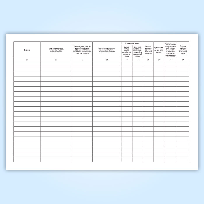 В графах с 10 по 19 журнала указываются мероприятия по оказанию медицинской помощи после передачи вызова скорой медицинской помощи бригаде скорой медицинской помощи. Эти графы заполняются после возращения бригады скорой медицинской помощи с вызова на основании записей в учетной форме Карта вызова скорой медицинской помощи 110/у, предусмотренной приложением №3.