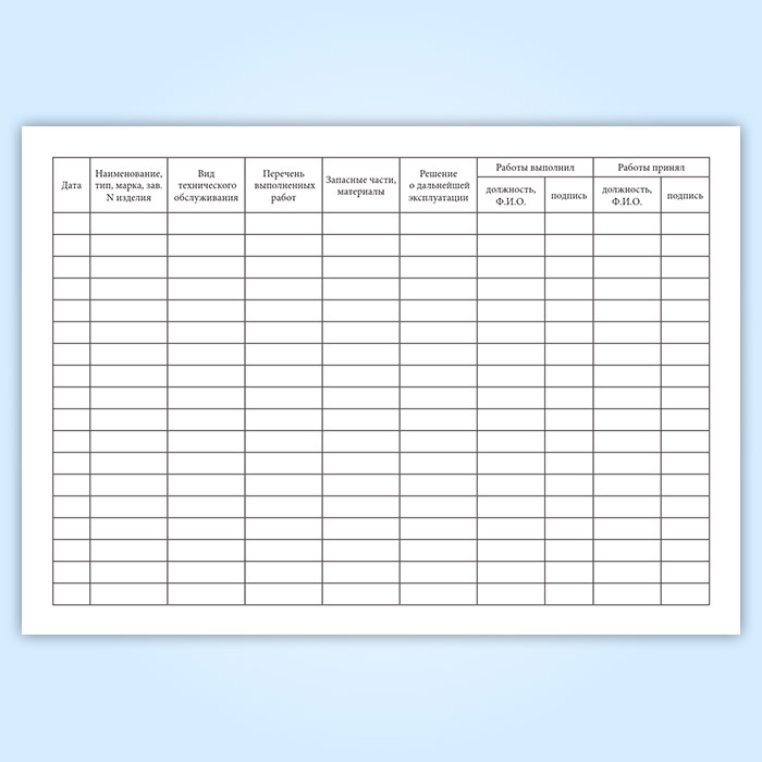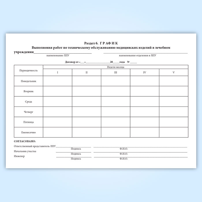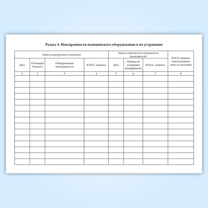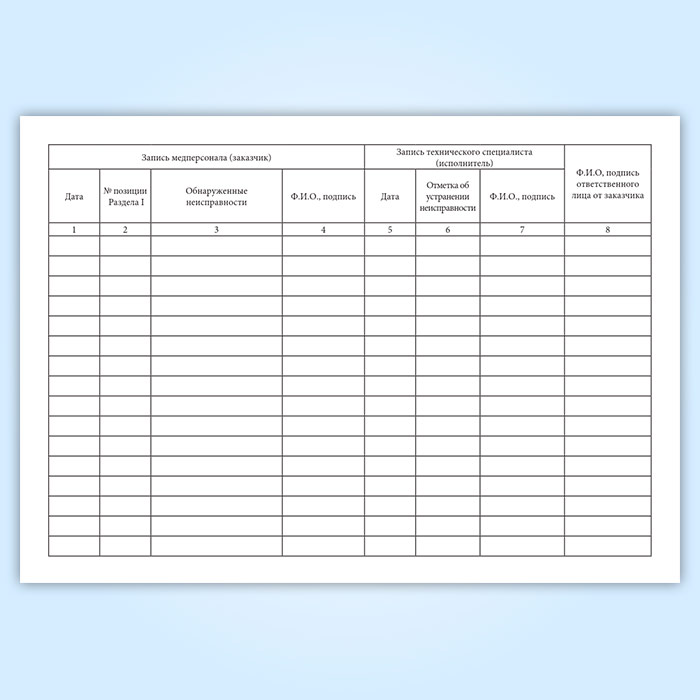 Журналы технического обслуживания заполняются специалистами, осуществляющими техническое обслуживание медицинской техники, указанной в 1-м разделе журнала и сотрудниками медицинского учреждения, ответственными за техническое состояние медицинской техники.