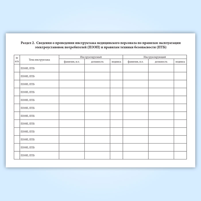 2) сведения о проведении инструктажа медперсонала по правилам эксплуатации электроустановок потребителей (ПЭЭП) и правилам техники безопасности (ПТБ);