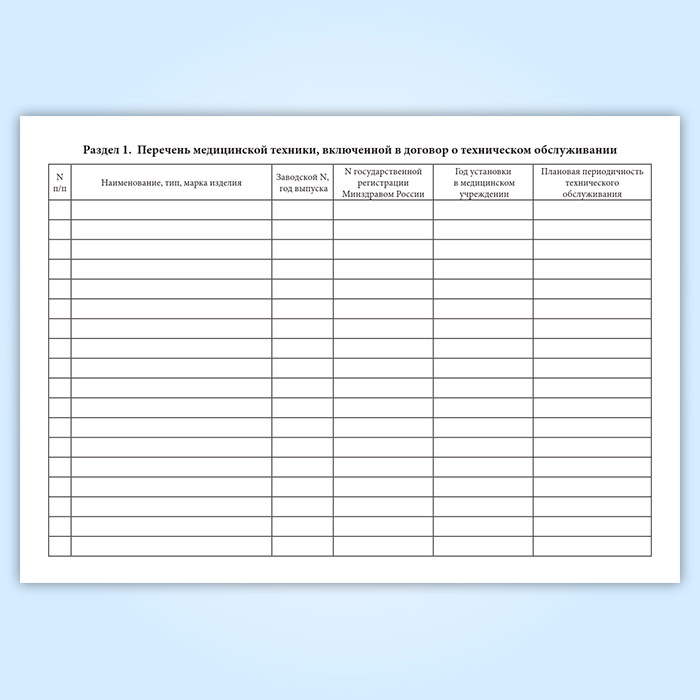 1) перечень медицинской техники, включенной в договор о техническом обслуживании между медицинским учреждением и службой технического обслуживания медицинской техники;