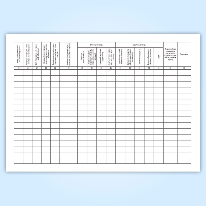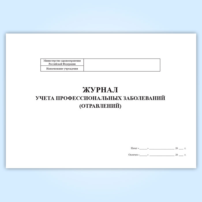Форма Журнала учета профессиональных заболеваний (отравлений) соответствует Приложению № 4 к Приказу Минздрава РФ от 28.05.2001 № 176 «О совершенствовании системы расследования и учета профессиональных заболеваний в РФ».