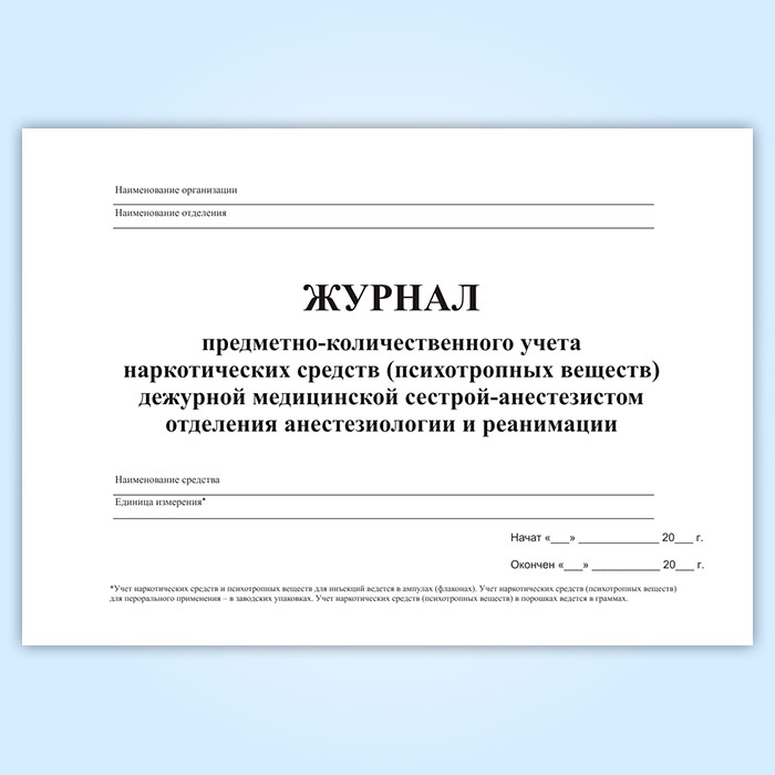 Предметно-количественный учет наркотических средств (психотропных веществ) отделения анастезиологии и реанимации ведет дежурная медицинская сестра-анастезист с помощью журнала.