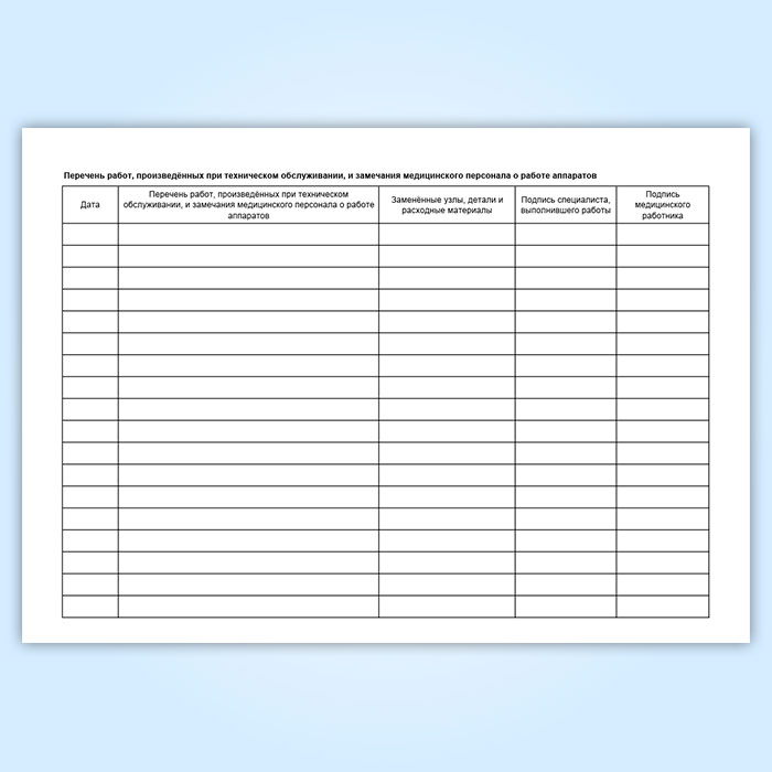 - Перечень работ, произведенных при техническом обслуживании, и замечания медицинского персонала о работе аппаратов