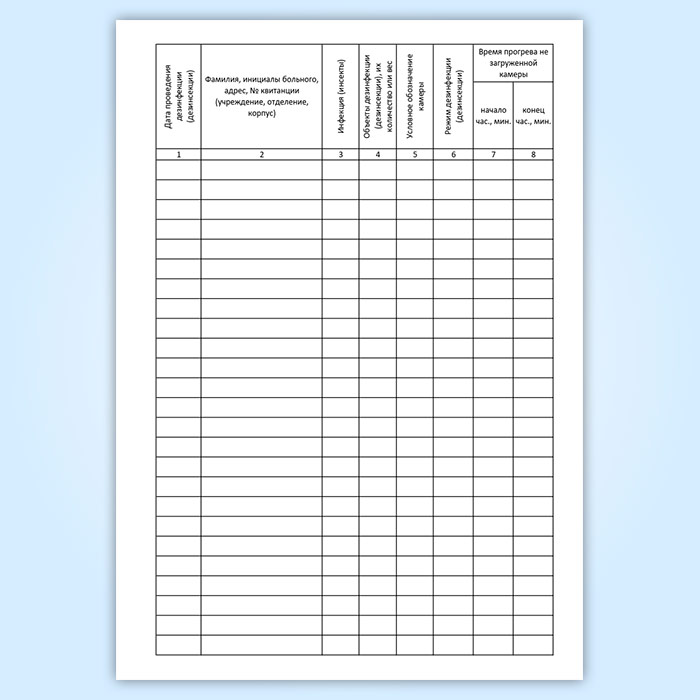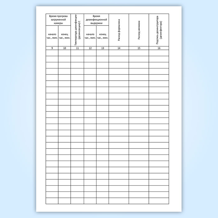 Журнал регистрации дезинфекции (дезинсекции) одежды, постельных принадлежностей, обуви и др. в дезинфекционных камерах (Форма № 353/у) имеет графы: