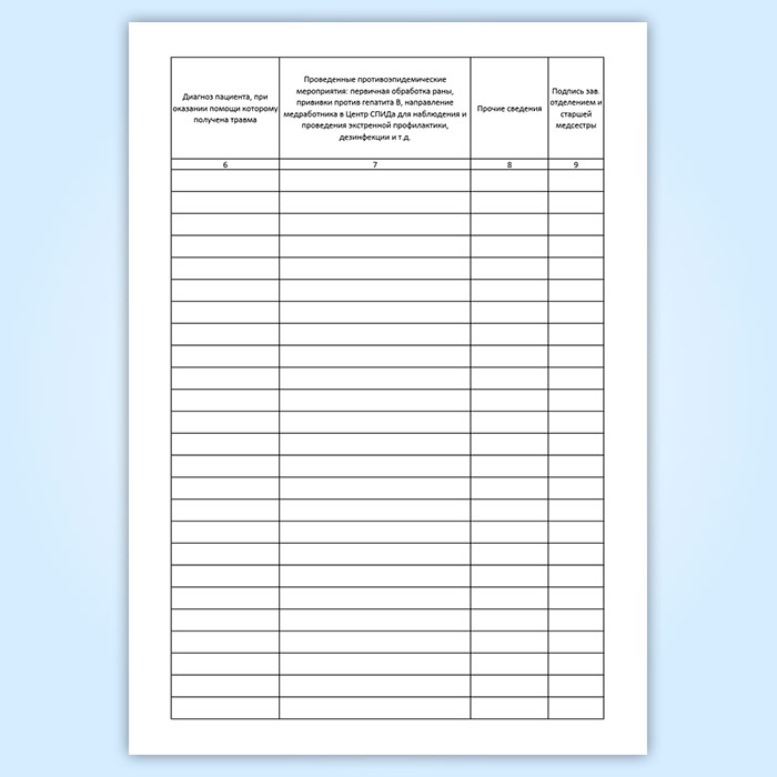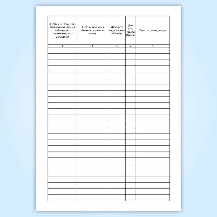 Форма журнала учета аварийных ситуаций, травм медицинского персонала соответствует Постановлению Главного государственного санитарного врача РФ от 09.12.2010 N 163 Об утверждении СанПиН 2.1.7.2790-10 "Санитарно-эпидемиологические требования к обращению с медицинскими отходами (вместе с СанПиН 2.1.7.2790-10. Санитарно-эпидемиологические правила и нормативы..."), а также Приложению 4 к Распоряжению Комитета по здравоохранению Администрации Санкт-Петербурга и Центра государственного санитарно-эпидемиологического надзора в Санкт-Петербурге от 27.04.2000 N 149-р/15 "О мерах по усилению борьбы с распространением ВИЧ-инфекции в Санкт-Петербурге".