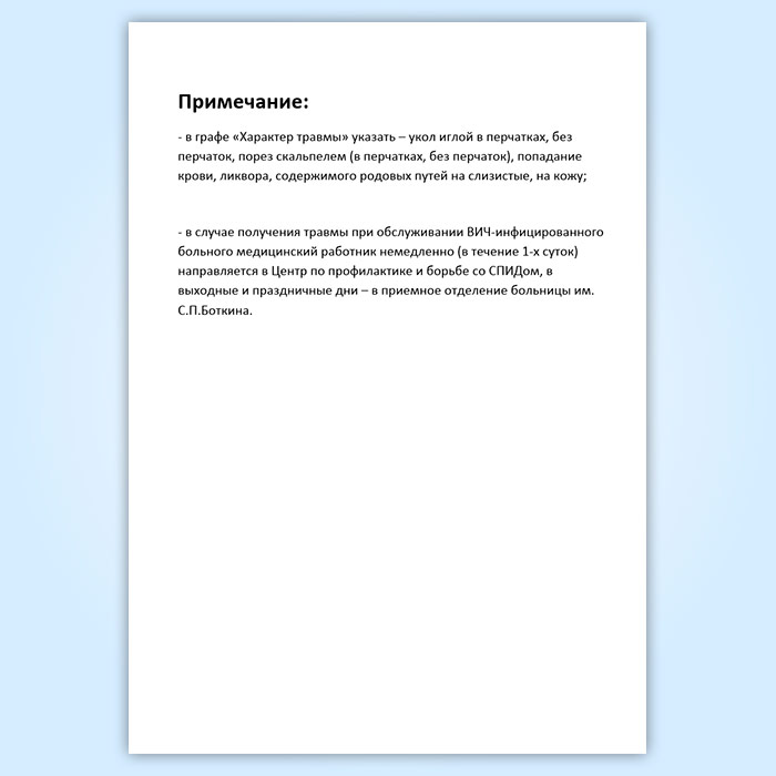 - в графе "Характер травмы" указать - укол иглой в перчатках, без перчаток, порез скальпелем (в перчатках, без перчаток), попадание крови, ликвора, содержимого родовых путей на слизистые, на кожу;