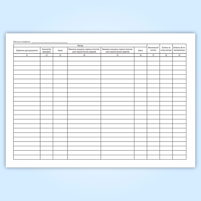 Форма журнала регистрации операций, связанных с оборотом наркотических средств и психотропных веществ в аптеке медицинской организации соответствует Приложению 5а к Инструкции о порядке приобретения, перевозки, хранения, учета, отпуска, использования, уничтожения, назначения и выписывания наркотических средств и психотропных веществ, внесенных в список II, психотропных веществ, внесенных в список III..