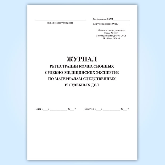 Форма журнала регистрации комиссионных судебно-медицинских экспертиз по материалам следственных и судебных дел (183/у) утверждена Приказом Минздрава СССР №1030 «Об утверждении форм первичной медицинской документации учреждений здравоохранения» от 4 октября 1980 г.