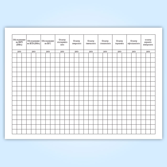 Для прохождения медицинского осмотра необходимо Направление на медицинский осмотр. Для контроля учета медицинского осмотра в мед.учреждениях используют форму журнала контроля учета медицинского осмотра.