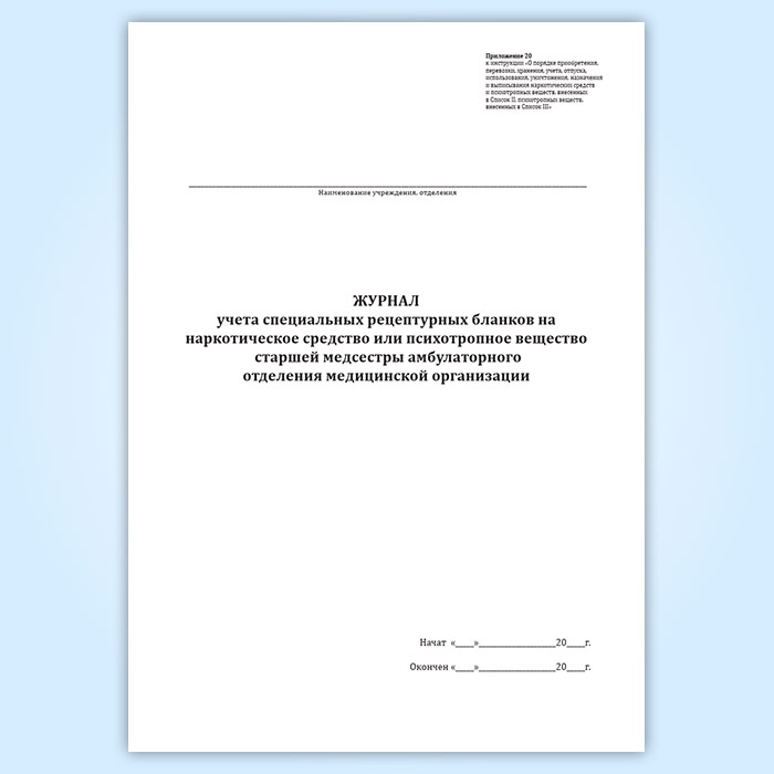 Форма журнала соответствует Приложению 20 к Приказу Департамента здравоохранения г. Москвы от 11.12.2015 N 1077 " О порядке приобретения, перевозки, хранения, учета, отпуска, использования, уничтожения, назначения и выписывания наркотических средств и психотропных веществ, внесенных в список II Перечня, психотропных веществ, внесенных в список III Перечня, в медицинских организациях государственной системы здравоохранения города Москвы"