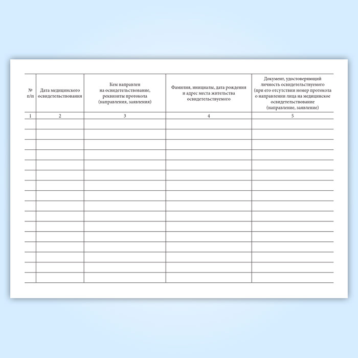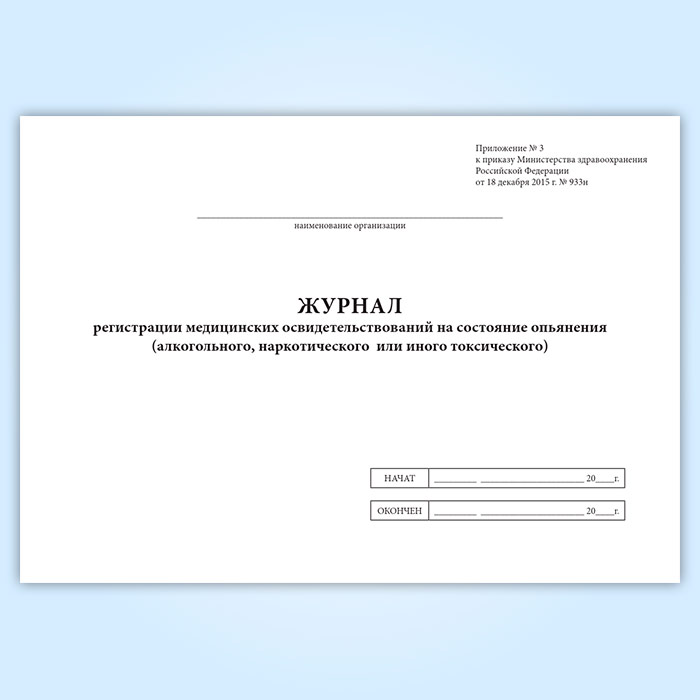 1. Форма “Журнал регистрации медицинских освидетельствований на состояние опьянения (алкогольного, наркотического или иного токсического)” ведется в медицинских организациях (их обособленных структурных подразделениях), осуществляющих медицинское освидетельствование на состояние опьянения (алкогольного, наркотического или иного токсического).