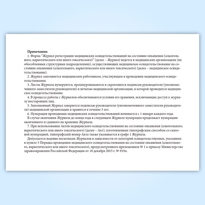 Допускается ведение нескольких Журналов в зависимости от категорий освидетельствуемых, указанных в пункте 5 Порядка проведения медицинского освидетельствования на состояние опьянения (алкогольного, наркотического или иного токсического), предусмотренного приложением № 1 к приказу Министерства здравоохранения Российской Федерации от 18 декабря 2015 г. № 933н.