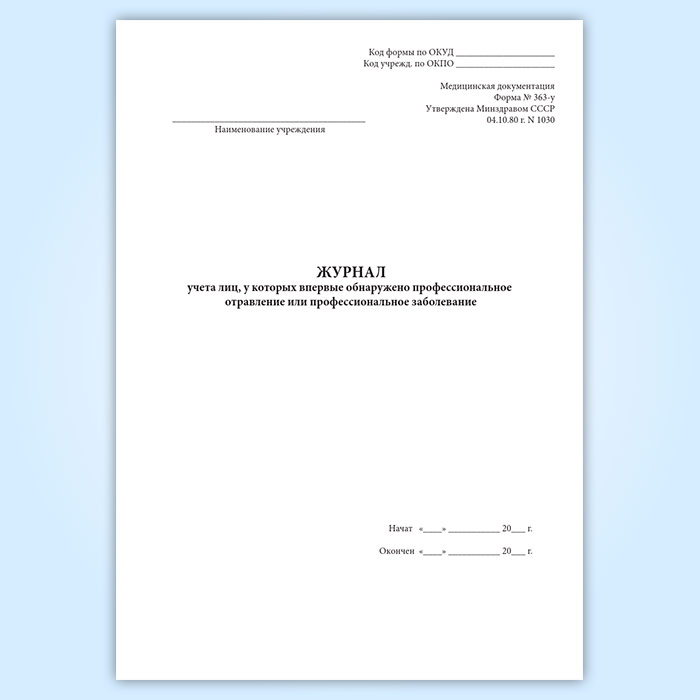 Форма журнала учета лиц, у которых впервые обнаружено профессиональное отравление или профессиональное заболевание (Форма 363-у) утверждена Приказом Минздрава СССР № 1030 " Об утверждении форм первичной медицинской документации учреждений здравоохранения" от 04.10.1980 года.