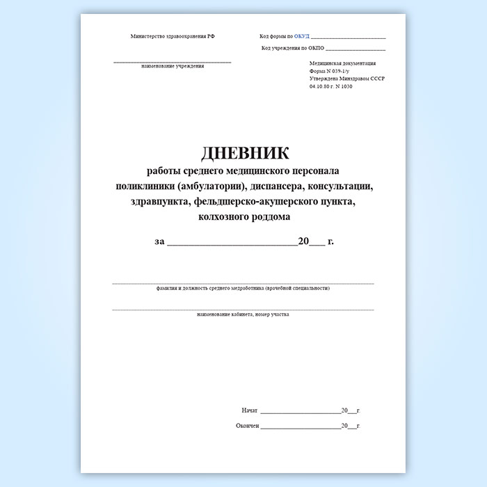 Форма дневника работы среднего медицинского персонала поликлиники (амбулатории), диспансера, консультации, здравпункта, фельдшерско-акушерского пункта, колхозного роддома (Форма 039-1/у) утверждена Приказом Минздрава СССР № 1030 " Об утверждении форм первичной медицинской документации учреждений здравоохранения" от 04.10.1980 года.