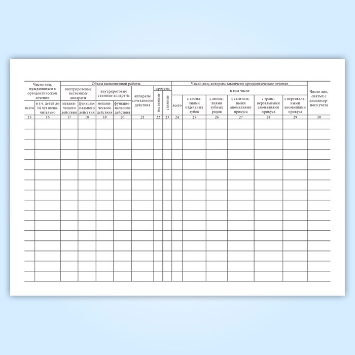 В графах 17-23 показывается число аппаратов и протезов, выданных за отчетный день, в графе 24 - общее число лиц, закончивших ортодонтическое лечение, с выделением в графы 25-29 сведений о лицах, закончивших лечение по поводу различных видов аномалий зубов и прикуса.