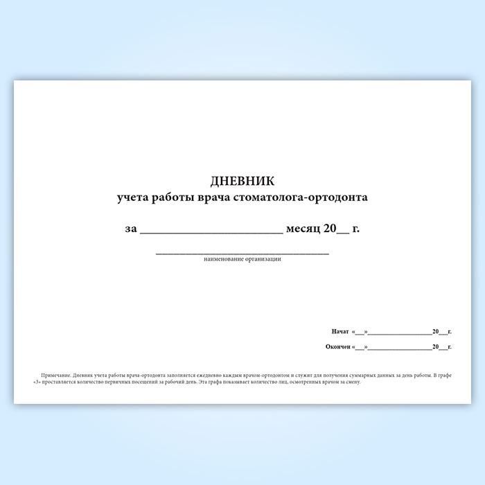 Дневник предназначен для учета работы врача - стоматолога ортодонта, ведущего амбулаторный прием в бюджетных и хозрасчетных учреждениях, обслуживающих взрослых и детей.