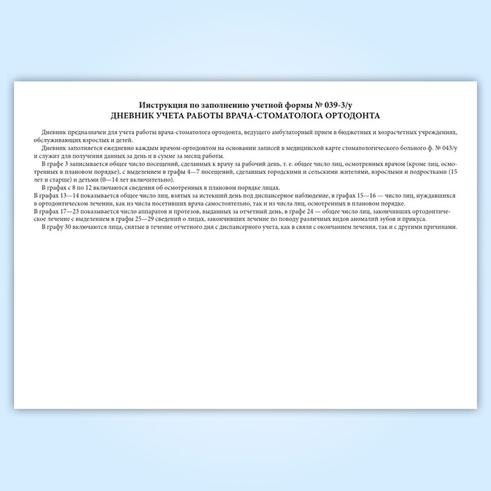 Форма дневника учета работы врача стоматолога-ортодонта № 039-3у, утверждена Приказом Минздрава СССР №1030 «Об утверждении форм первичной медицинской документации учреждений здравоохранения» от 4 октября 1980 г.