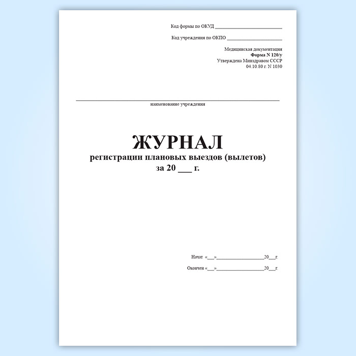 Форма журнала регистрации плановых выездов (вылетов) (Форма 120/у) утверждена Приказом Минздрава СССР № 1030 " Об утверждении форм первичной медицинской документации учреждений здравоохранения" от 04.10.1980 года