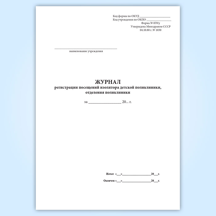 Форма журнала регистрации посещений изолятора детской поликлиники, отделения поликлиники № 059/У утверждена приказом Минздрава СССР от 04.10.80 N 1030 (ред. от 31.12.2002) " Об утверждении форм первичной медицинской документации учреждений здравоохранения " .