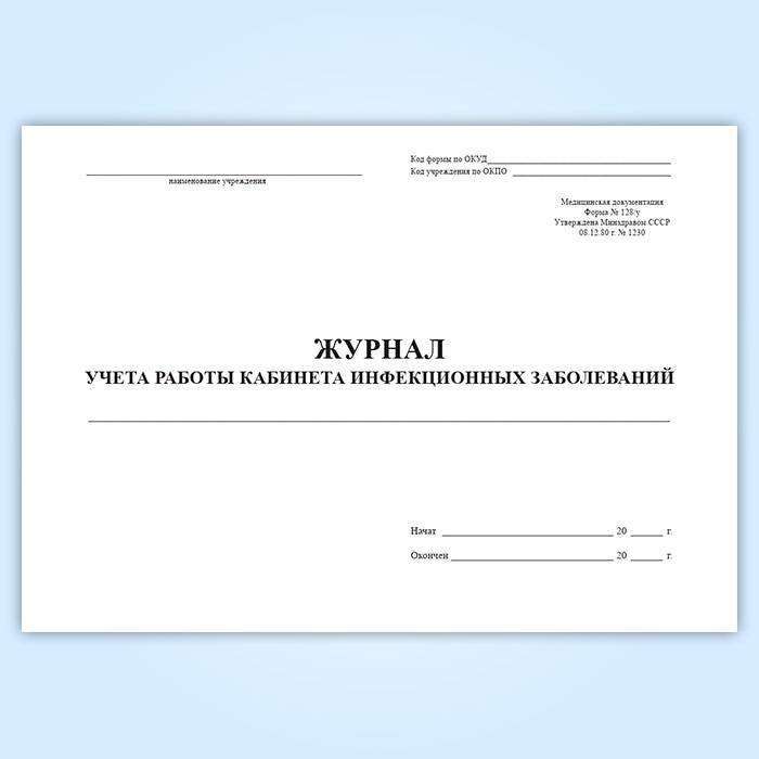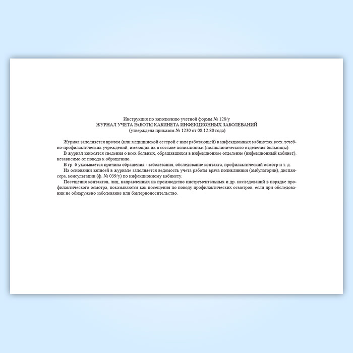 Форма журнала учета работы кабинета инфекционных заболеваний (Форма 128/у) соответствует Приложению 1 к Приказу Минздрава СССР № 1230 "О внесении дополнения в перечень форм первичной медицинской документации" от 08.12.1980 года.