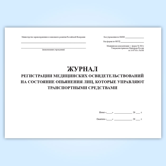 Форма журнала регистрации медицинских освидетельствований на состояние опьянения лиц, которые управляют транспортными средствами по форме 304/у соответствует Приложению 2 к Приказу Минздрава РФ № 308 "О медицинском освидетельствовании на состояние опьянения" от 14.07.2003 года.