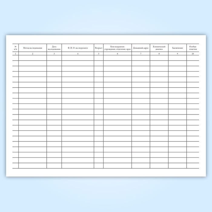 При обследовании одного пациента одномоментно (при одном обращении) несколькими различными методами функциональной диагностики с выдачей отдельных врачебных заключений по каждому методу каждое исследование регистрируется под новым порядковым номером с заполнением всех граф журнала.