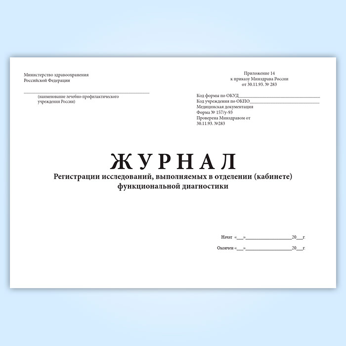 Форма журнала регистрации исследований, выполняемых в отделении (кабинете) функциональной диагностики (Форма 157/у-93) соответствует Приложению 14 к Приказу Минздрава РФ № 283 "О совершенствовании службы функциональной диагностики в учреждениях здравоохранения Российской Федерации" от 30.11.1993 года.