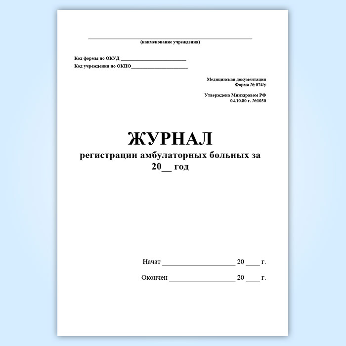 Журнал регистрации амбулаторных больных, форма 074/у утвержден Приказом Минздрава СССР №1030 «Об утверждении форм первичной медицинской документации учреждений здравоохранения» от 4 октября 1980 г.