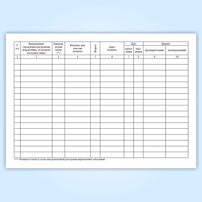 Для учета инфекционных заболеваний в медицинских учреждениях ведут журнал учета инфекционных заболеваний (Форма 060/у) , для учета работы кабинета инфекционных заболеваний - журнал учета работы кабинета инфекционных заболеваний (Форма 128/у).