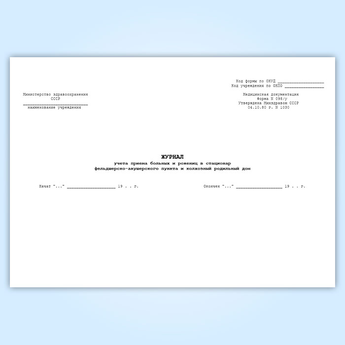 Форма журнала учета приема больных и рожениц в стационар фельдшерско-акушерского пункта, колхозного родильного дома (Форма 098/у) соответствует Приказу Минздрава СССР № 1030 " Об утверждении форм первичной медицинской документации учреждений здравоохранения" от 04.10.1980 года.