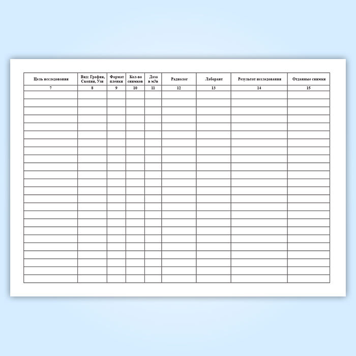 Данный журнал заполняет сотрудник (лаборант) рентгенологического кабинета. Журнал содержит всю информацию о пациентах, прошедших диагностику в лечебных или профилактических целях.