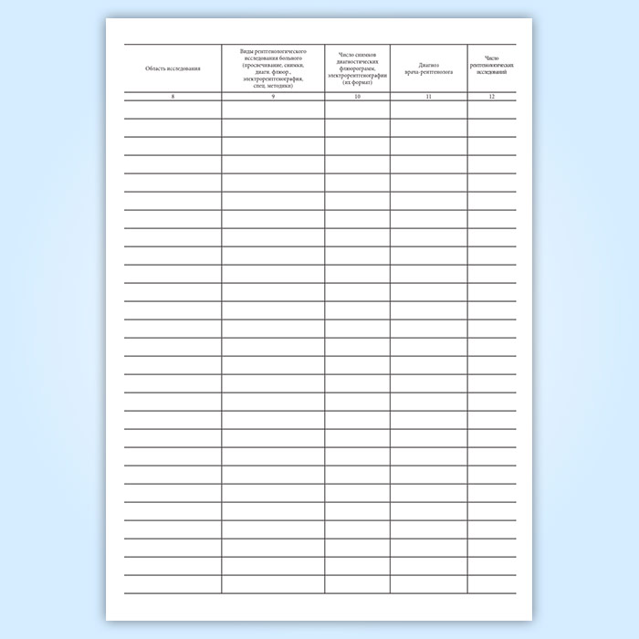 В графе 10 указывается количество сделанных снимков (пленок), электрорентгенограмм (формат), флюорограмм, включая и снимки, сделанные с применением специальных методов.