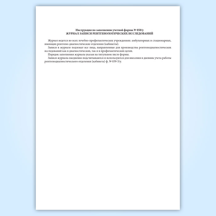 Журнал записи рентгенологических исследований (Форма 050/у), утвержден Приказом Минздрава СССР №1030 «Об утверждении форм первичной медицинской документации учреждений здравоохранения» от 4 октября 1980 г.