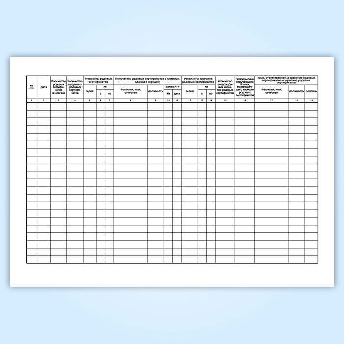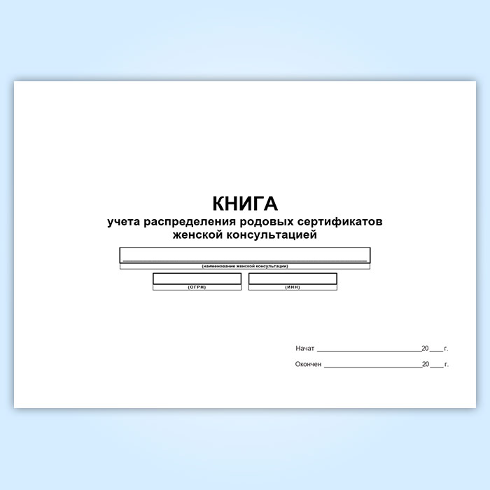 Форма книги учета распределения родовых сертификатов женской консультацией соответствует Приложению 3 «Порядку обеспечения родовыми сертификатами государственных и муниципальных учреждений здравоохранения, их учета и хранения» к Приказу Минздравсоцразвития России № 701 «О родовом сертификате» от 28 ноября 2005 (с изменениями на 8 мая 2009 года).