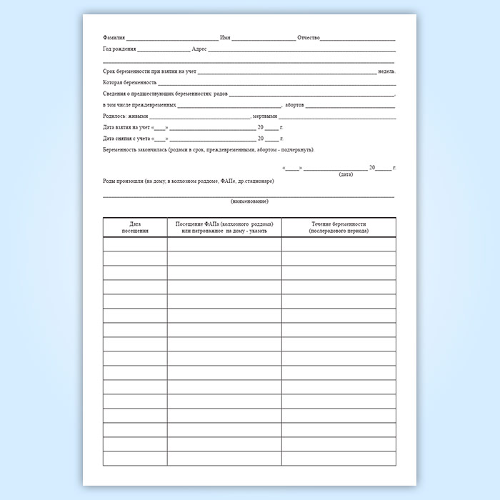 Для каждой беременной отводится страница тетради. Паспортная часть и анамнестические данные заполняются при взятии беременной под наблюдение. Последующие строки - по окончании беременности на основании данных, полученных из того учреждения, в котором произошли роды (аборт).