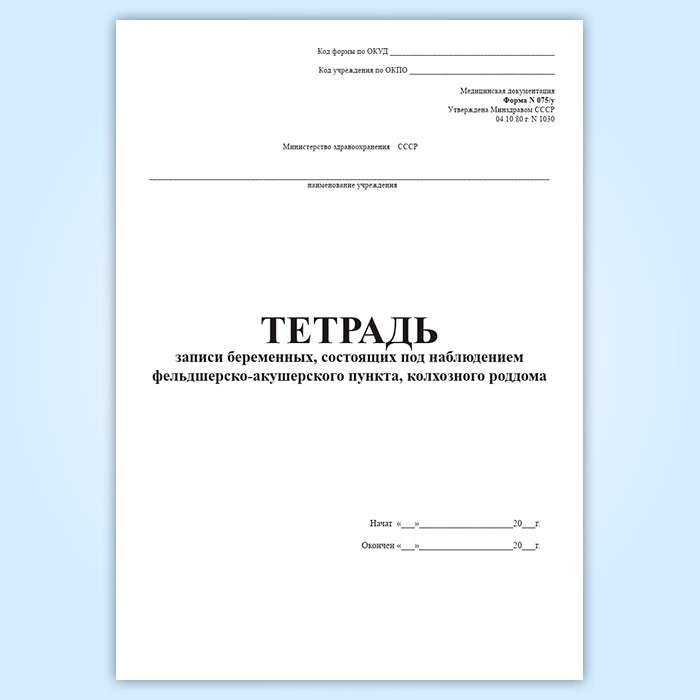 Тетрадь записи беременных, состоящих под наблюдением ФАП, колхозного роддома форма 075/у, утверждена Приказом Минздрава СССР №1030 «Об утверждении форм первичной медицинской документации учреждений здравоохранения» от 4 октября 1980 г.